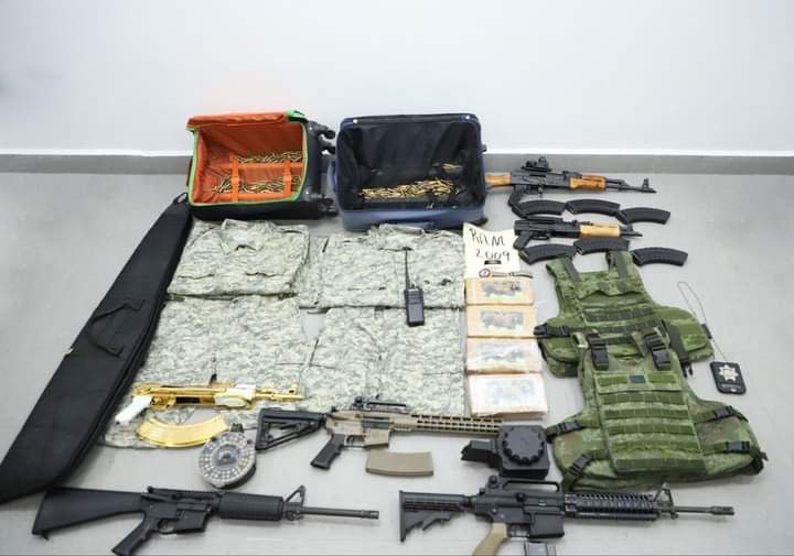 También se decomisaron mil 363 cartuchos de arma de fuego de diferente calibres, 36 cargadores de arma larga, 4 mil 581 gramos de droga con características de la  cocaína, seis chalecos tácticos (dos de ellos tipo militar), cuatro camisolas militares, dos pantalones militares, tres radios de comunicación tipo PTT, una perforadora manual de ductos, dos maletas, una funda para arma de fuego y un porta credencial de policía, aparentemente apócrifo.