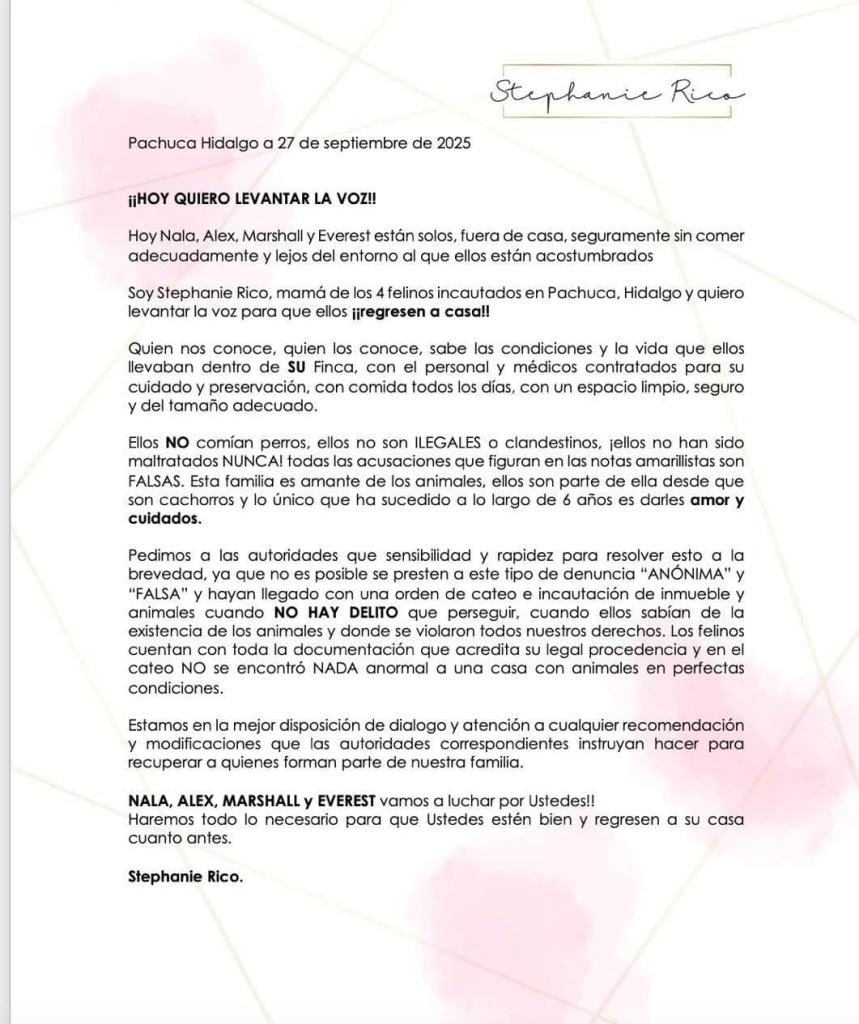 Hoy Nala, Alex, Marshall y Everest están solos, fuera de casa, seguramente sin comer adecuadamente y lejos del entorno al que ellos están acostumbrados. Soy Stephanie Rico, mamá de los cuatro felinos incautados en Pachuca, Hidalgo y quiero levantar la voz para que ellos ¡¡Regresen a casa!!”, publicó en el documento en sus redes sociales.